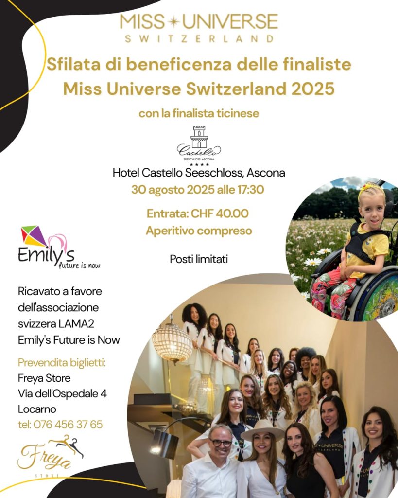 Ascona: Sfilata delle finaliste Miss Universe Switzerland 2025 con la Ticinese Naima Acosta, la madrina della nostra associazione – 30.08.2025